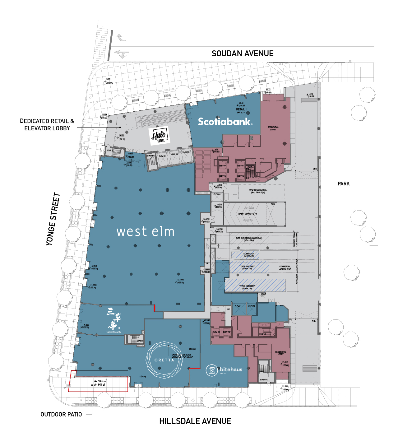 2131 Yonge Street boasts a first-class real estate mix with over 82,200 SF of retail, 624 residential units, and 156 underground parking stalls. With a two-storey glass façade fronting Yonge Street, the retail consists of national tenants including Farm Boy, Scotiabank, West Elm, and downtown Toronto restaurant mainstay Oretta which has made 2131 Yonge home to its second location. Sansotei Ramen has recently opened, adding another destination use to an impressive roster of retail tenants.