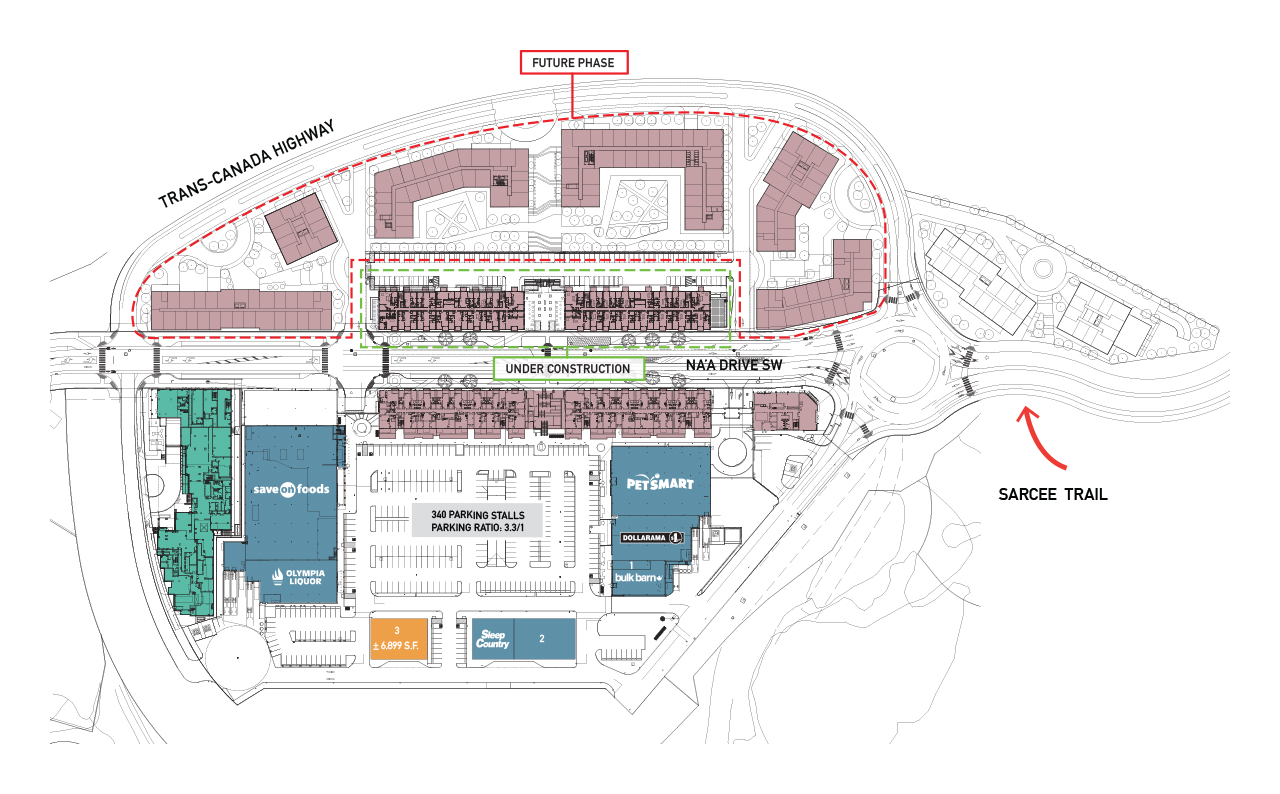 The residential is bookended with two retail components totaling over 290,000 SF, and is estimated to generate over 2,000 jobs for Calgarians. Town Centre is the grocery anchored component with Save-on Foods, PetSmart, Bulk Barn, Dollarama, and Olympia Liquor. In the Gateway portion you will find yourself in the lifestyle component of the development, anchored by GoodLife Fitness, Sofa Land, and a North American renowned radiology clinic, Beam Radiology. All anchor tenants are now open accompanied by Booster Juice, Easy Financial, Papa John’s, and Telus, amongst others. With more retailers slated to open and take possession over the next few months, don’t miss the opportunity to join the national retail mix in units of various sizes, including units with patio potential!