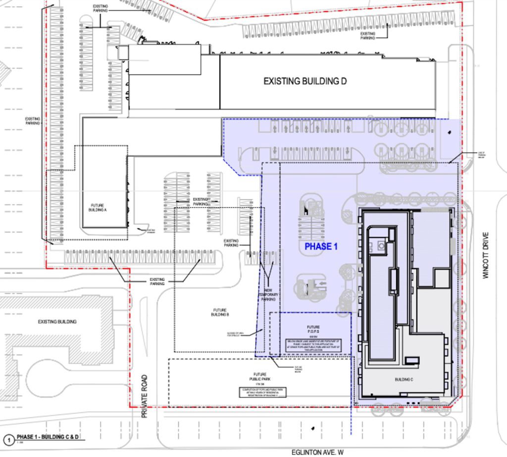 Phase One consists of the 12-storey tower at the southeast corner of the site, fronting both Wincott and Eglinton. Phase Two would then include the partial demolition and renovation of the existing plaza building.